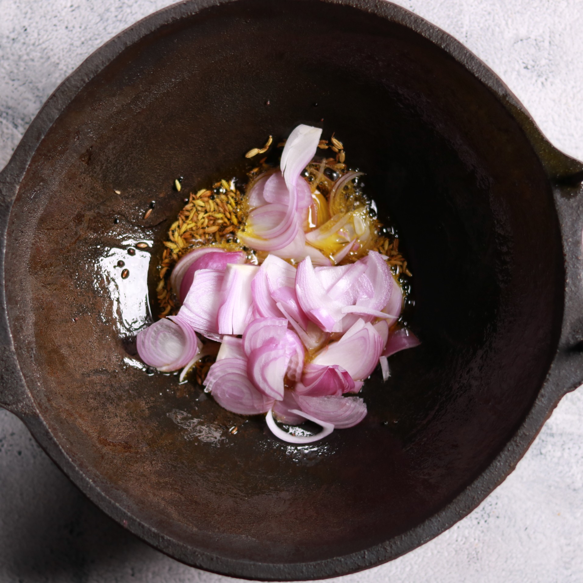 - Heat mustard oil in a cast iron pan over medium-high heat until it begins to smoke slightly.
