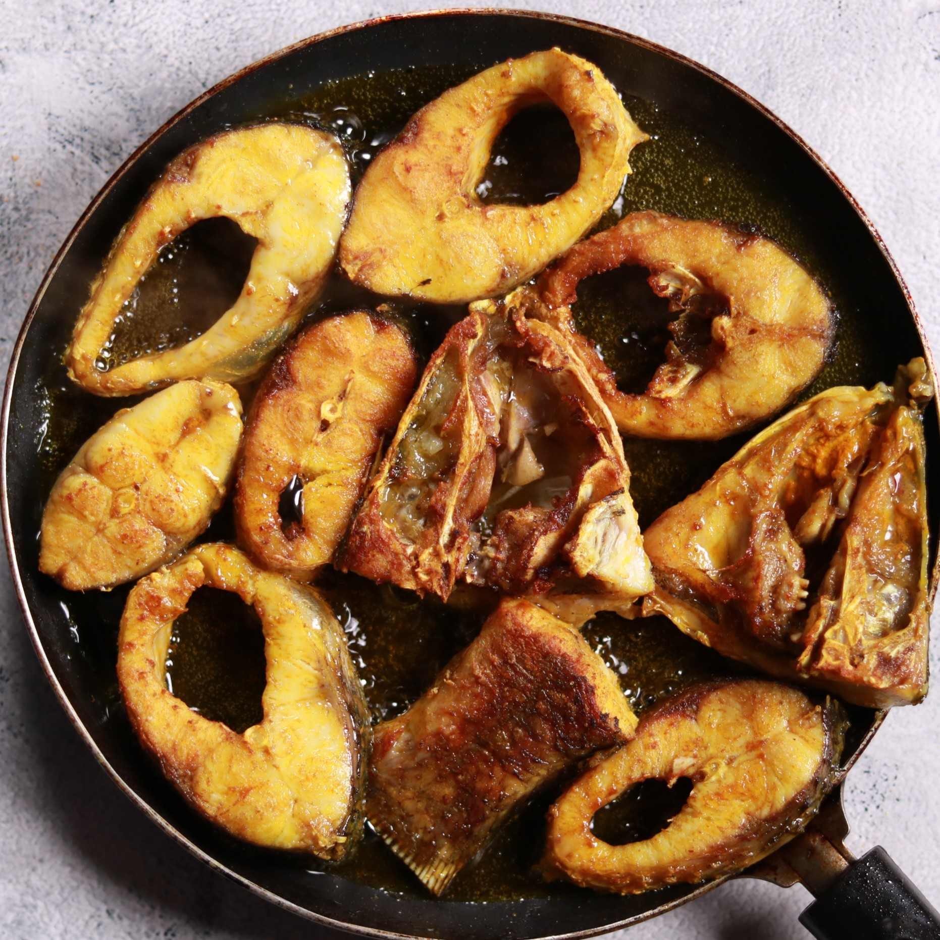 - Carefully add marinated fish pieces and shallow fry for 2 minutes on each side until golden brown.