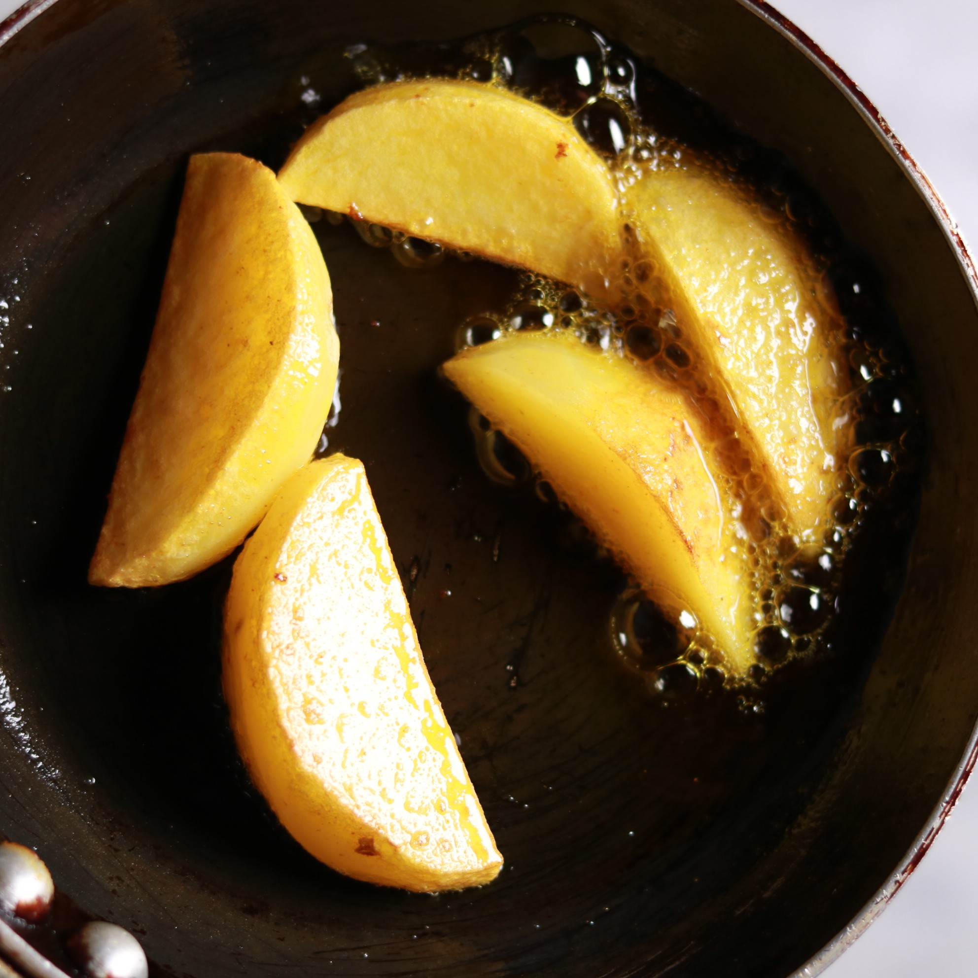 - Add potato wedges to the same oil and fry until they're golden and tender, about 4-5 minutes.