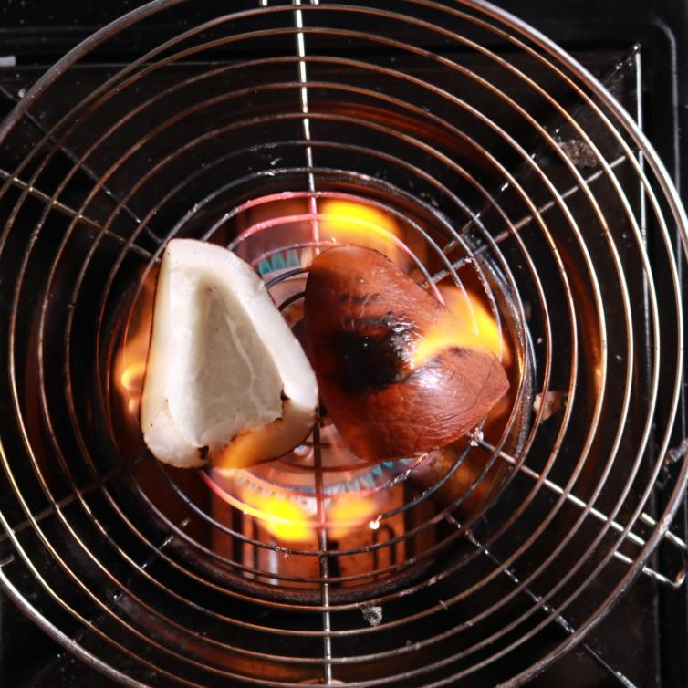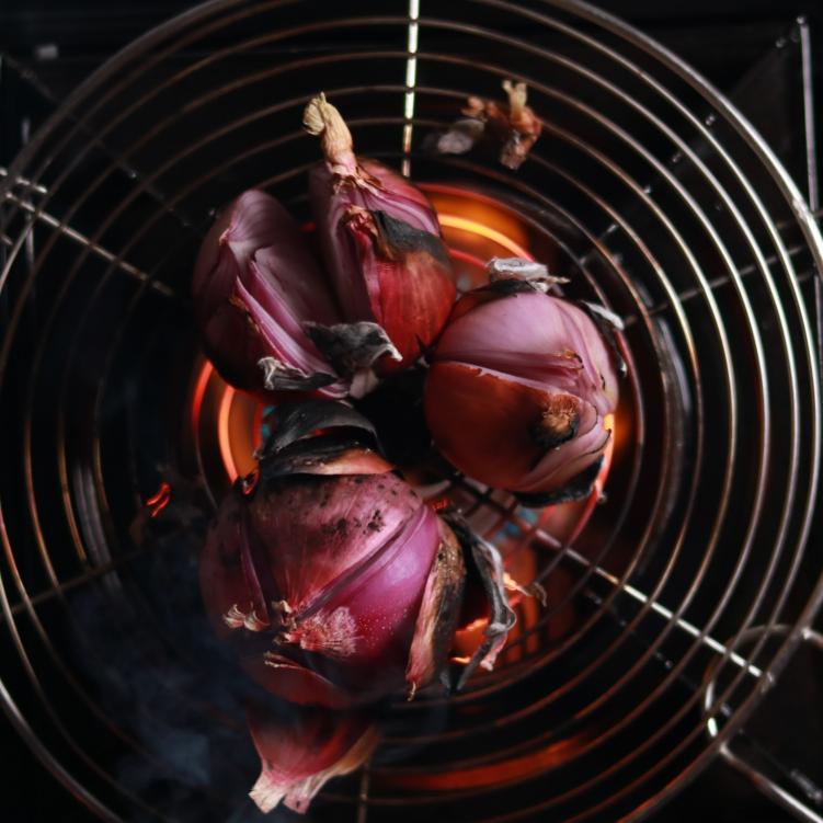 - Burn to char the onion on the open flame, turn with the tongue and char evenly