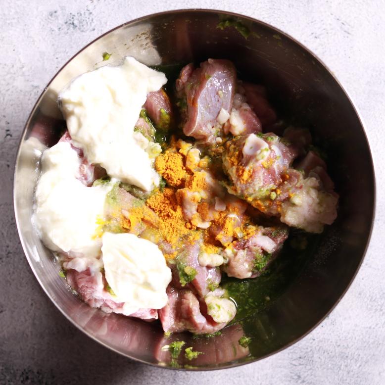 - Add the paste, curd (yogurt), salt, and turmeric powder to the mutton.