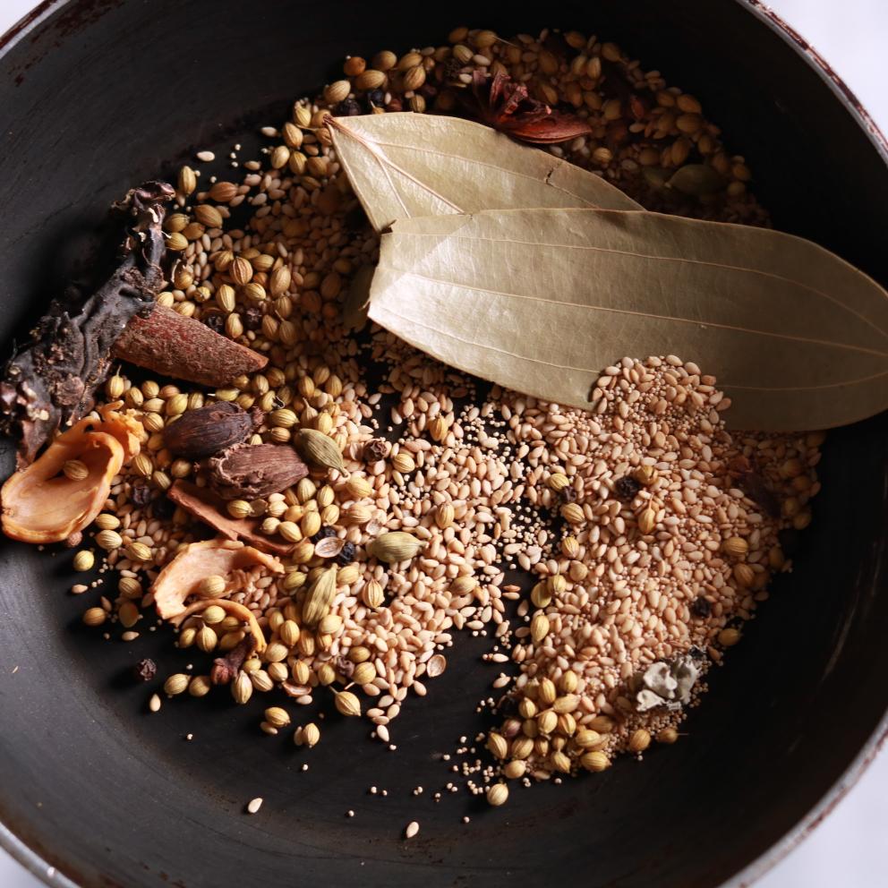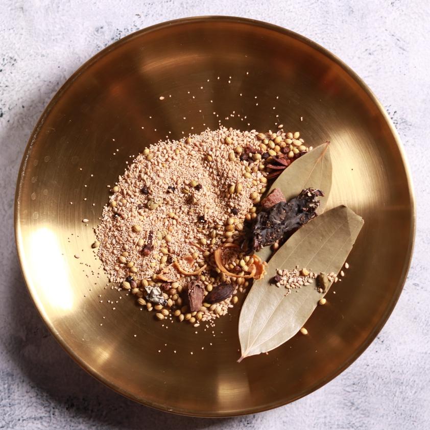 Time for the fun part making that namesake masala. Heat a heavy pan low, toss in sesame, coriander, cardamoms, peppercorns, bay, black cardamoms, cloves, cinnamon, mace, star anise, and stone flower. Roast 3-4 minutes till fragrant and a shade darker no oil, just dry heat to unlock oils. [query provided]