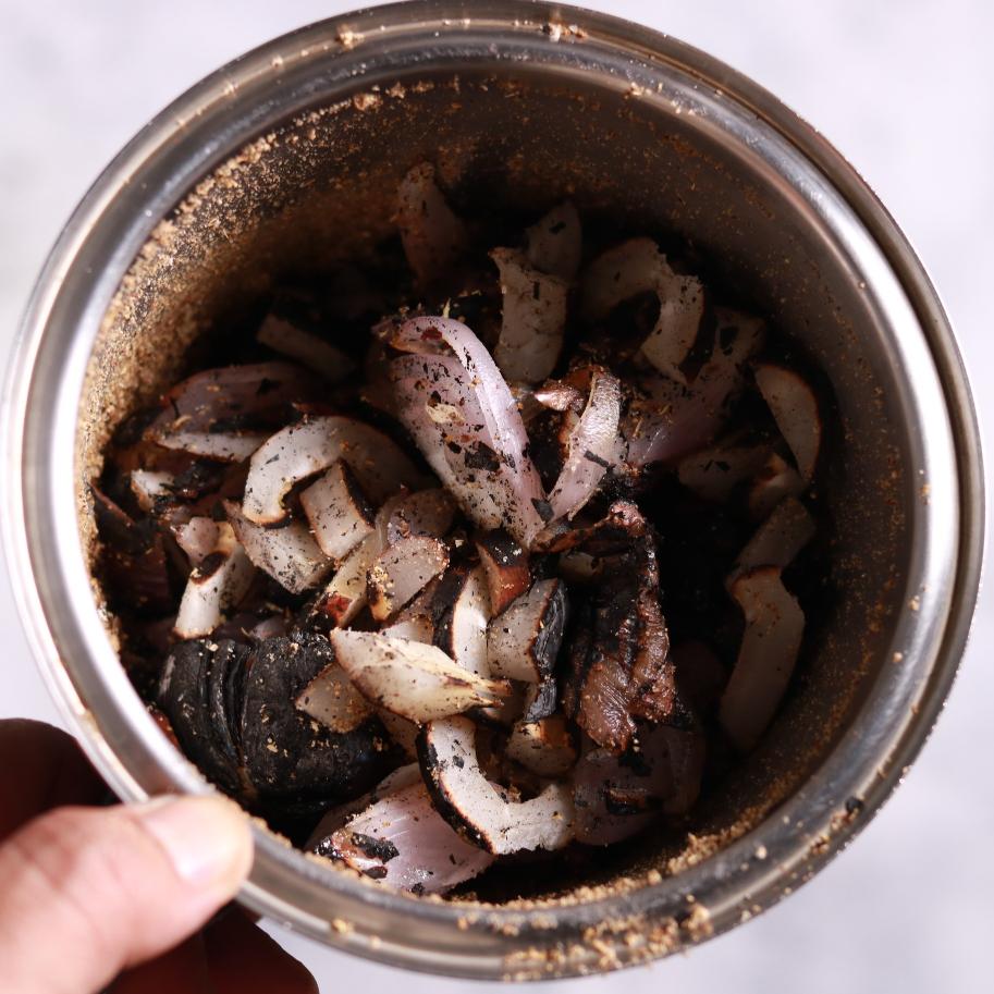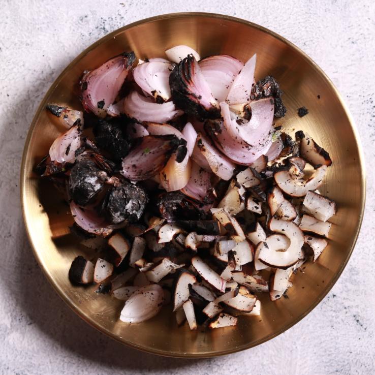 - Let both chared onion and coconut cool slightly and chop