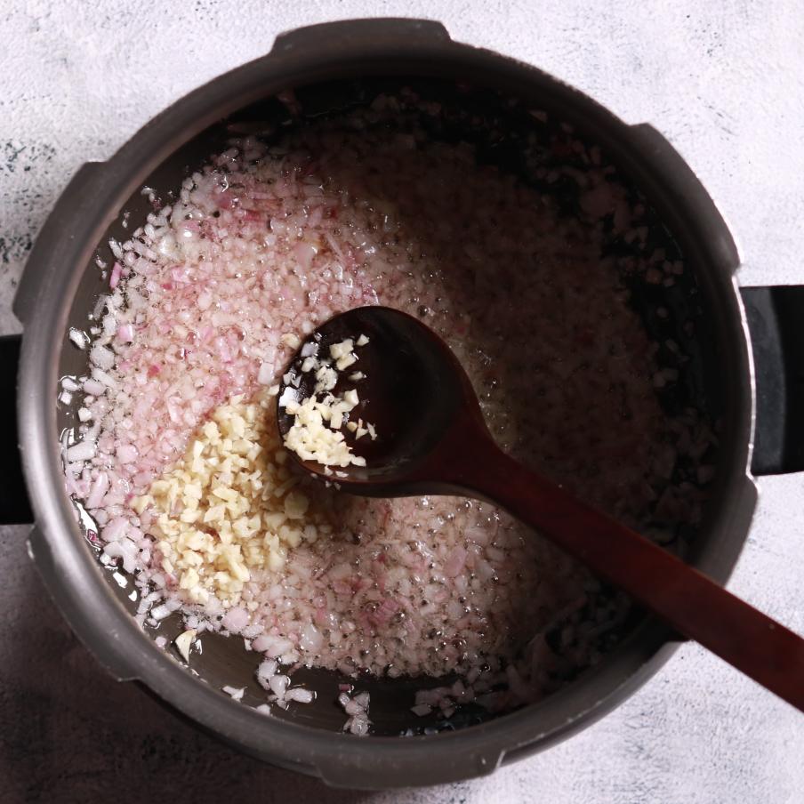 - Heat oil in a pressure cooker or heavy-bottomed pot over medium heat.