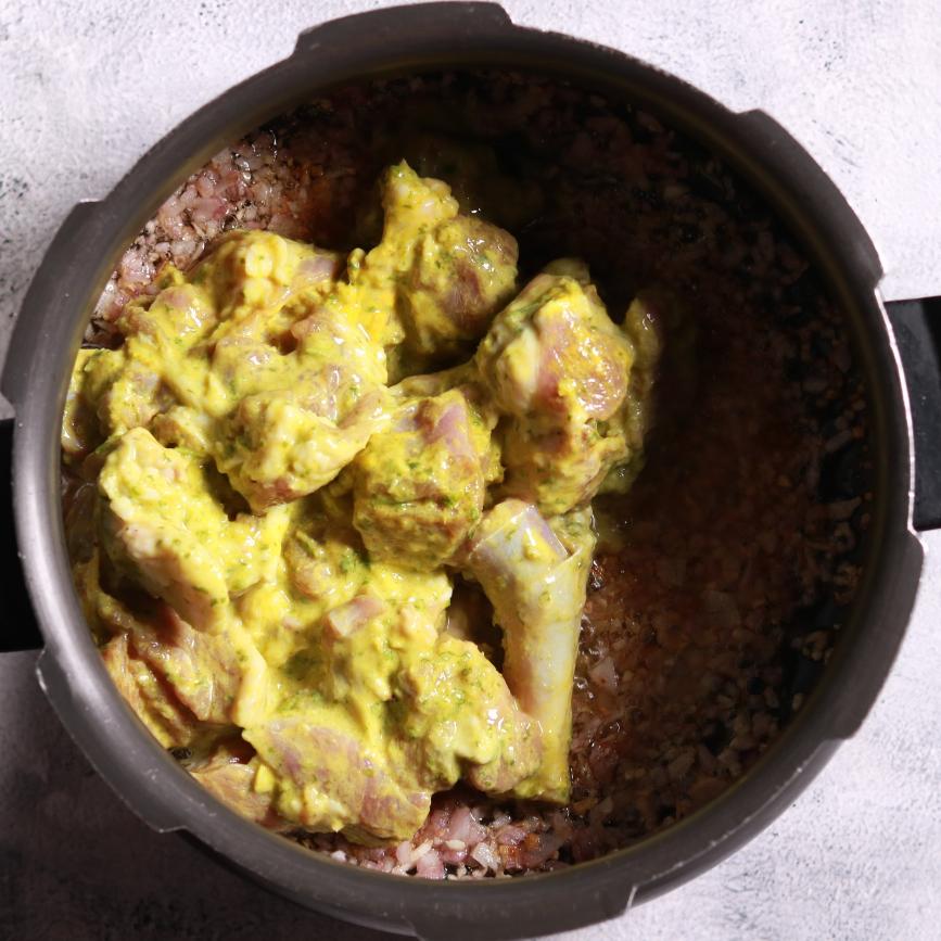 - Add the marinated mutton and sauté for 5 minutes, stirring occasionally.